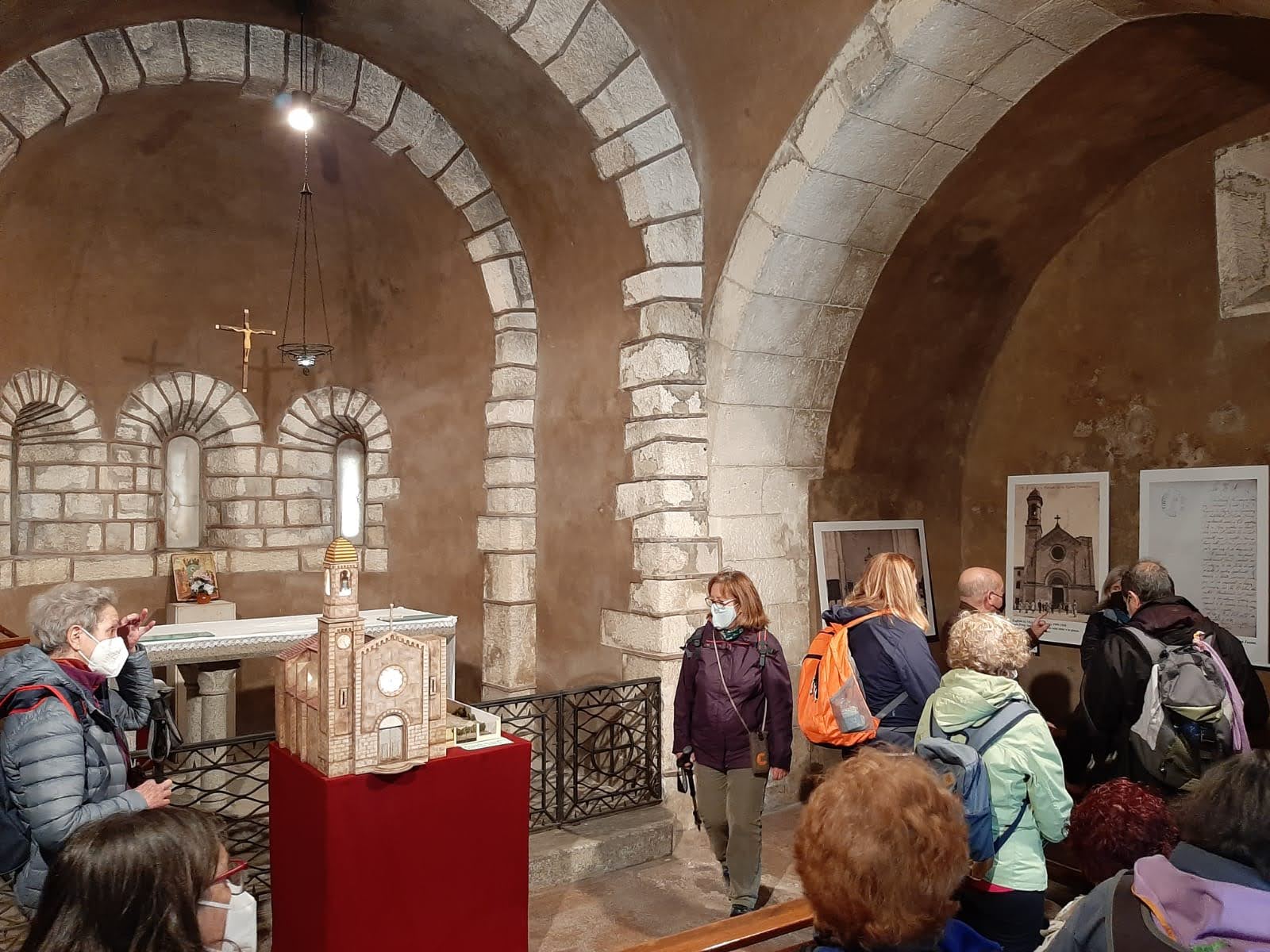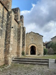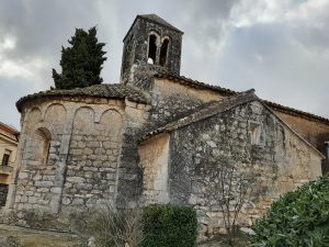 Tenim la sort de trobar-nos al senyor Pere Mitjans que té cura de l’antiga església romànica i ens fa tota l’explicació. Es tracta de la capella de Sant Cugat de Moja, documentada des del s X. Un edici d’una sola nau, amb volta de canó i absis semicircular. El campanar és una petita torre de planta quadrada. A l’interior s’hi conserva una antiga pica baptismal sense decoració i un sarcòfag alçat que podria ser de l’època gòtica. Tot un descobriment.