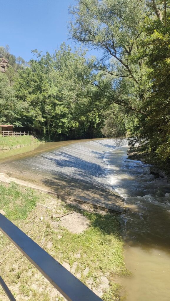 Vam baixar cap a la Vall del Llobregat (fent uns 500m. de carretera) fins a Can Riera i, en baixada suau i gaudint d’un bosc de ribera, vam arribar a la Resclosa dels Manresans on comença la Sèquia. També hi ha un observatori d’aus i unes formacions rocoses anomenades “Les Dames Coiffèes”.